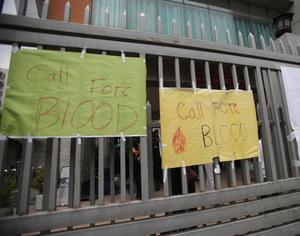 (250722) -- DHAKA, 22 julio, 2025 (Xinhua) -- Carteles pidiendo donación de sangre son vistos en el exterior de un centro médico, donde se atiende a los heridos del accidente, en Dhaka, Bangladesh, el 22 de julio de 2025. Ha aumentado a 27, 25 de ellos niños, el número de muertos tras estrellarse un avión de entrenamiento de la Fuerza Aérea de Bangladesh en un campus escolar el lunes. (Xinhua/Habibur Rahman) (oa) (ah) (vf)