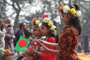 (250222) -- DHAKA, 22 febrero, 2025 (Xinhua) -- Imagen del 21 de febrero de 2025 de niñas participando en un acto conmemorativo por el Día Internacional de la Lengua Materna, en Dhaka, Bangladesh. Cientos de miles de personas en la capital de Bangladesh, Dhaka, rindieron homenaje el viernes a los activistas del movimiento lingüístico del país que sacrificaron sus vidas ese día en 1952. (Xinhua/Habibur Rahman) (oa) (da)