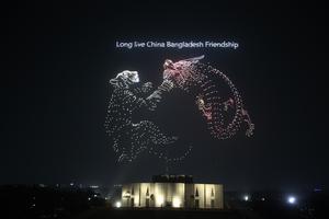 (250415) -- DHAKA, 15 abril, 2025 (Xinhua) -- Imagen del 14 de abril de 2025 de un espectáculo de drones en celebración del Año Nuevo bengalí y el 50 aniversario del establecimiento de relaciones diplomáticas entre Bangladesh y China, en Dhaka, Bangladesh. (Xinhua/Habibur Rahman) (oa) (ah) (ce)