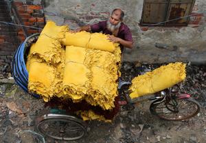 (250622) -- DHAKA, 22 junio, 2025 (Xinhua) -- Imagen del 21 de junio de 2025 de un empleado transportando pieles en una fábrica de curtiduría, en Savar, en las afueras de Dhaka, Bangladesh. (Xinhua) (rtg) (da)