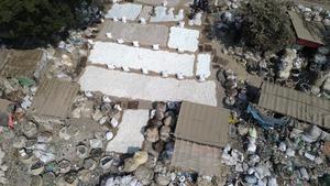 (260201) -- DHAKA, 1 febrero, 2026 (Xinhua) -- Vista aérea tomada con un dron el 31 de enero de 2026 de residuos plásticos apilados y clasificados a lo largo de las orillas del río Buriganga, en Dhaka, Bangladesh. (Xinhua/Habibur Rahman) (oa) (da)
