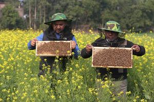 (260111) -- MUNSHIGANJ, 11 enero, 2026 (Xinhua) -- Apicultores sosteniendo panales son vistos en un campo, en Munshiganj, Bangladesh, el 11 de enero de 2026. (Xinhua/Habibur Rahman) (oa) (ah) (ce)