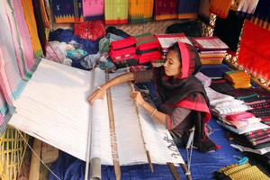 (250129) -- NARAYANGANJ, 29 enero, 2025 (Xinhua) -- Imagen del 28 de enero de 2025 de una artesana tejiendo telas con habilidades tradicionales durante una feria de artesanía y festival folclórico, en Narayanganj, Bangladesh. Una feria de artesanía y festival folclórico de un mes de duración se llevan a cabo aquí para presentar las tradiciones y la cultura populares. El evento continuará hasta el 14 de febrero. (Xinhua/Habibur Rahman) (jg) (da) (ce)