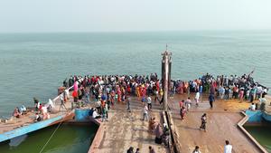 (260326) -- RAJBARI, 26 marzo, 2026 (Xinhua) -- Imagen tomada con un dron el 26 de marzo de 2026 de rescatistas trabajando en el sitio donde un autobús de pasajeros cayó al río Padma, en el distrito de Rajbari, Bangladesh. Al menos dieciocho cuerpos fueron recuperados el miércoles después de que un autobús que transportaba a docenas de pasajeros cayera al río Padma desde un pontón en una terminal en el distrito de Rajbari de Bangladesh, a unos 125 kilómetros al sur de Dhaka. (Xinhua/Habibur Rahman) (jg) (ah) (vf)