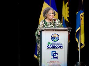 (250220) -- BRIDGETOWN, 20 febrero, 2025 (Xinhua) -- Imagen del 19 de febrero de 2025 de Carla Barnett, secretaria general de la Comunidad del Caribe (CARICOM), pronunciando un discurso en la ceremonia de apertura de la 48ª Reunión Ordinaria de la CARICOM, llevada a cabo en Bridgetown, capital de Barbados. La 48ª Reunión Ordinaria de la Conferencia de Jefes de Gobierno de la CARICOM comenzó el miércoles en Bridgetown. La agenda de la reunión incluye la seguridad alimentaria y nutricional, el cambio climático y la resiliencia digital. (Xinhua/Douglas Martinez) (rtg) (ra) (ce)