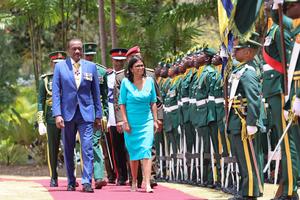 (260427) -- BRIDGETOWN, 27 abril, 2026 (Xinhua) -- Imagen proveída por la Presidencia de Venezuela de la presidenta encargada venezolana, Delcy Rodríguez (c), y el presidente de Barbados, Jeffrey Bostic (i), pasando revista a la guardia de honor en la sede del Estado, en Bridgetown, Barbados, el 27 de abril de 2026. (Xinhua/Presidencia de Venezuela) (ms) (ah) (vf)