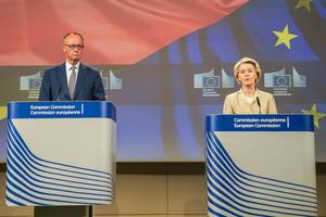 (250510) -- BRUSELAS, 10 mayo, 2025 (Xinhua) -- Imagen del 9 de mayo de 2025 del canciller alemán, Friedrich Merz (i), y la presidenta de la Comisión Europea, Ursula von der Leyen, asistiendo a una conferencia de prensa conjunta, en Bruselas, Bélgica. Merz llegó aquí para una visita el viernes. (Xinhua/Peng Ziyang) (oa) (da)