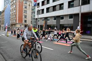 (250921) -- BRUSELAS, 21 septiembre, 2025 (Xinhua) -- Personas circulan en bicicleta frente a un grupo que practica yoga en una calle durante el Domingo sin Automóviles, en Bruselas, Bélgica, el 21 de septiembre de 2025. Bruselas celebró el fin de semana su Domingo sin Automóviles anual, convirtiendo la mayoría de las calles de la capital belga en zonas libres de automóviles durante todo el día. Desde las 9:30 a. m. hasta las 7 p. m. hora local del domingo, se prohibió la circulación de vehículos motorizados en toda la región de Bruselas, con la excepción del transporte público, los taxis, los servicios de emergencia, la policía y las personas con un permiso especial. (Xinhua/Lyu You) (oa) (ah)