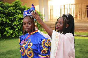 (251109) -- COTONU, 9 noviembre, 2025 (Xinhua) -- Imagen del 8 de noviembre de 2025 de estudiantes del Instituto Confucio de la Universidad de Abomey-Calavi preparando sus trajes tradicionales chinos para el Desfile de Moda China-Benín en la plaza central del Palacio de Congreso, en Cotonú, Benín. Organizado conjuntamente por el Centro Cultural Chino en Benín y el Instituto Confucio de la Universidad de Abomey-Calavi, el desfile representó un esfuerzo creativo más para profundizar el diálogo cultural: una celebración de la inclusión china y el arte beninés, entrelazados a través de la imaginación compartida. (Xinhua/Seraphin Zounyekpe) (oa) (ah)