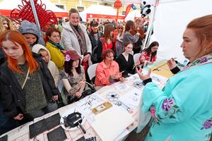 (250601) -- MINSK, 1 junio, 2025 (Xinhua) -- Imagen del 31 de mayo de 2025 de personas probando la pintura tradicional china durante el evento cultural "Té para la Armonía: Salón Cultural Yaji", celebrado en Minsk, Bielorrusia. (Xinhua/Henadz Zhinkov) (oa) (rtg) (da)