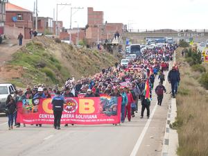 (260103) -- CALAMARCA, 3 enero, 2026 (Xinhua) -- Personas participan en la marcha "Bolivia no se vende" convocada por la Central Obrera Boliviana para exigir la abrogación del Decreto Supremo 5503, en la carretera La Paz-Oruro, en Calamarca, Bolivia, el 3 de enero de 2025. (Xinhua/Javier Mamani) (jm) (oa) (ra) (ce)