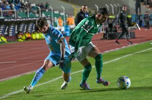 (250425) -- LA PAZ, 25 abril, 2025 (Xinhua) -- Imagen del 24 de abril de 2025 del jugador Patricio Rodríguez (i), de Bolívar de Bolivia, disputando el balón con Joaquín Piquerez (d), de Palmeiras de Brasil, durante el partido del grupo G de la jornada 3 de la fase de grupos de la Copa Conmebol Libertadores, celebrado en el Estadio Hernando Siles, en la ciudad de La Paz, Bolivia. (Xinhua/Javier Mamani) (jm) (rtg) (ra) (vf)