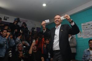 (251019) -- LA PAZ, 19 octubre, 2025 (Xinhua) -- El candidato a la Presidencia de Bolivia por el partido Alianza Libre, Jorge "Tuto" Quiroga (d), muestra su carnet electoral después de emitir su voto en un colegio electoral, en la ciudad de La Paz, Bolivia, el 19 de octubre de 2025. Bolivia abrió el domingo a las 08:00 hora local las mesas de sufragio para iniciar la votación en la histórica segunda vuelta presidencial con el fin de elegir a sus nuevos gobernantes, con ocho horas de votación y 7.567.207 de ciudadanos habilitados en el país y 369.931 en 22 naciones en el exterior. (Xinhua/Javier Mamani) (jm) (ah) (da)