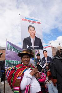 (250510) -- LA PAZ, 10 mayo, 2025 (Xinhua) -- Una indígena sostiene una pancarta con la imagen del presidente del Senado boliviano, Andrónico Rodríguez, durante el acto de proclamación como candidato a la Presidencia de Bolivia convocado por movimientos sociales, en la ciudad de El Alto, Bolivia, el 10 de mayo de 2025. (Xinhua/Javier Mamani) (jm) (jg) (da)
