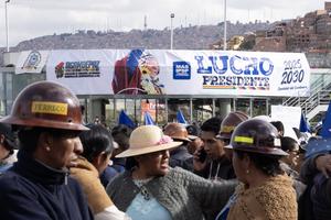 (250429) -- LA PAZ, 29 abril, 2025 (Xinhua) -- Imagen del 28 de abril de 2025 de mineros asistiendo al acto de proclamación del presidente boliviano, Luis Arce, como candidato a la presidencia de Bolivia por el Movimiento Al Socialismo para las próximas elecciones del 17 de agosto, en la Plaza Villarroel, en La Paz, Bolivia. (Xinhua/Javier Mamani) (jm) (ah) (ra) (vf)