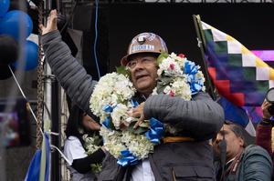 (250429) -- LA PAZ, 29 abril, 2025 (Xinhua) -- Imagen del 28 de abril de 2025 del presidente boliviano, Luis Arce, saludando durante el acto de proclamación como candidato a la presidencia de Bolivia por el Movimiento Al Socialismo para las próximas elecciones del 17 de agosto, en el palco de la Plaza Villarroel, en La Paz, Bolivia. (Xinhua/Javier Mamani) (jm) (ah) (ra) (vf)