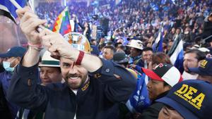 (250628) -- LA PAZ, 28 junio, 2025 (Xinhua) -- Imagen del 27 de junio del 2025 del candidato a la Presidencia de Bolivia, Eduardo del Castillo (frente), llegando a su proclamación como candidato e inicio de campaña presidencial del oficialista Movimiento Al Socialismo previo a las elecciones generales del próximo 17 de agosto, en el Coliseo Cerrado Julio Borelli Viteritto, en La Paz, Bolivia. (Xinhua/Javier Mamani) (jm) (jg) (da)