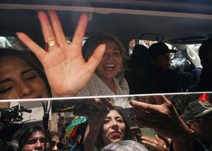 (251106) -- LA PAZ, 6 noviembre, 2025 (Xinhua) -- La expresidenta interina boliviana, Jeanine Añez (c), saluda a sus simpatizantes a bordo de un automóvil después de salir del penal de Miraflores, en La Paz, Bolivia, el 6 de noviembre de 2025. Añez (2019-2020), recuperó el jueves su libertad, tras cuatro años y ocho meses de reclusión en el penal de Miraflores, en la ciudad de La Paz, luego de que el Tribunal Supremo de Justicia anuló la sentencia de 10 años de cárcel por un supuesto golpe de Estado. (Xinhua/Javier Mamani) (jm) (rtg) (ra) (da)