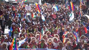 (250516) -- LA PAZ, 16 mayo, 2025 (Xinhua) -- Indígenas participan en una marcha en apoyo al expresidente boliviano Evo Morales, en la ciudad de La Paz, Bolivia, el 16 de mayo de 2025. La multitudinaria marcha de sectores afines al expresidente boliviano Evo Morales concluyó el viernes con violentos enfrentamientos entre la Policía y los manifestantes en inmediaciones del Tribunal Supremo Electoral en La Paz, en medio de una tensa jornada marcada por gases lacrimógenos, piedras, detenidos, heridos y denuncias de agresiones a periodistas. (Xinhua/Javier Mamani) (jm) (rtg) (ra) (vf)
