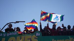(250516) -- LA PAZ, 16 mayo, 2025 (Xinhua) -- Simpatizantes del expresidente boliviano Evo Morales, ondean banderas durante una marcha en apoyo al expresidente, en la ciudad de La Paz, Bolivia, el 16 de mayo de 2025. La multitudinaria marcha de sectores afines al expresidente boliviano Evo Morales concluyó el viernes con violentos enfrentamientos entre la Policía y los manifestantes en inmediaciones del Tribunal Supremo Electoral en La Paz, en medio de una tensa jornada marcada por gases lacrimógenos, piedras, detenidos, heridos y denuncias de agresiones a periodistas. (Xinhua/Javier Mamani) (jm) (rtg) (ra) (vf)