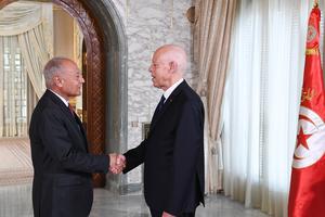 (250416) -- TUNEZ, 16 abril, 2025 (Xinhua) -- Imagen del 15 de abril de 2025 del presidente tunecino, Kais Saied (d), estrechando la mano del secretario general de la Liga Arabe, Ahmed Aboul Gheit, durante su reunión, en Túnez, Túnez. Saied reafirmó el martes el apoyo inquebrantable de su país a la causa palestina y al establecimiento de un Estado palestino soberano con Jerusalén Este como su capital. (Xinhua/Presidencia de Túnez) (ah) (ra) (ce)