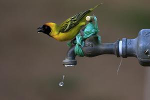 (250523) -- GABORONE, 23 mayo, 2025 (Xinhua) -- Imagen del 7 de diciembre de 2024 de un tejedor enmascarado de ojos rojos bebiendo agua de un grifo doméstico con fuga, en la aldea de Molepolole, Botsuana. Botsuana celebró el jueves el Día Internacional de la Diversidad Biológica en Maun para priorizar la conservación de la biodiversidad en el uso de la tierra y la planificación espacial. (Xinhua/Metlha Ngubevana) (rtg) (ra) (ce)
