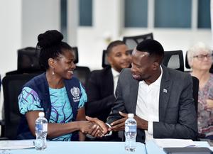(250408) -- GABORONE, 8 abril, 2025 (Xinhua) -- Imagen del 7 de abril de 2025 de Juliet Bataringaya (i), funcionaria a cargo de la Organización Mundial de la Salud (OMS) en Botsuana, estrechando la mano del ministro interino de Salud de Botsuana, Lawrence Ookeditse, durante la conmemoración del Día Mundial de la Salud, en Gaborone, Botsuana. La OMS declaró el lunes en Botsuana que los recortes en la financiación mundial a la salud podrían tener graves repercusiones en los servicios críticos de atención sanitaria materna y neonatal en Africa, afectando a millones de personas. (Xinhua/Tshekiso Tebalo) (oa) (ah) (ce)