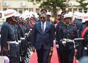 (251110) -- GABORONE, 10 noviembre, 2025 (Xinhua) -- El presidente de Botsuana, Duma Boko (c), inspecciona la guardia de honor previo a pronunciar el Discurso sobre el Estado de la Nación de este año, en Gaborone, Botsuana, el 10 de noviembre de 2025. (Xinhua/Tshekiso Tebalo) (oa) (ah) (ce)
