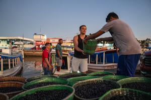 (251110) -- AMAPA, 10 noviembre, 2025 (Xinhua) -- Imagen del 9 de noviembre de 2025 de empleados descargando frutas frescas transportadas en un bote, en Macapá, capital del estado de Amapá, Brasil. Hoy, mientras la atención mundial se centra en la conservación del Amazonas, Macapá se erige como un claro ejemplo de armonía entre la vida humana y la naturaleza. (Xinhua/Wang Tiancong) (rtg) (ah) (ce)