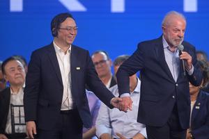 (251009) -- BAHIA, 9 octubre, 2025 (Xinhua) -- El presidente brasileño, Luiz Inácio Lula da Silva (d), habla junto al presidente de BYD, Wang Chuanfu (i), durante la inauguración de la nueva planta de vehículos eléctricos e híbridos de la china BYD Brasil, en Camacari, en el estado de Bahía, Brasil, el 9 de octubre de 2025. La ceremonia marcó el inicio de la producción brasileña y consolida al país sudamericano como un polo estratégico de la compañía para América Latina. (Xinhua/Lucio Tavora) (lt) (da) (ra) (vf)