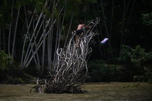 (251003) -- BELEM, 3 octubre, 2025 (Xinhua) -- Un niño trepa un arbusto en la orilla del río Guamá, en la Isla de Cumbú, en Belém, en el estado de Pará, Brasil, el 3 de octubre de 2025. El Servicio Brasileño de Apoyo a las Micro y Pequeñas Empresas, paraestatal financiada por el Gobierno de Brasil y el sector privado, lanzó en idioma chino la versión de su video institucional para la 30ª Conferencia de las Partes (COP30) de Naciones Unidas sobre Cambio Climático a efectuarse en noviembre en el estado de Pará. (Xinhua/Lucio Tavora) (lt) (jg) (rtg) (ce)