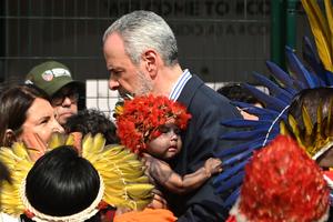 (251114) -- BELEM, 14 noviembre, 2025 (Xinhua) -- El presidente de la 30ª Conferencia de las Partes (COP30) de la Convención Marco de las Naciones Unidas sobre el Cambio Climático, André Correa do Lago (d), sostiene a un niño indígena en el exterior del pabellón en donde se lleva a cabo la COP30, en Belém, estado de Pará, Brasil, el 14 de noviembre de 2025. (Xinhua/Lucio Tavora) (lt) (oa) (da)