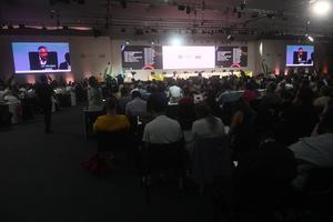 (251122) -- BELEM, 22 noviembre, 2025 (Xinhua) -- El presidente de la 30ª Conferencia de las Partes (COP30) de las Naciones Unidas sobre el Cambio Climático, el embajador brasileño André Correa do Lago (en pantalla), habla durante una sesión plenaria de la COP30, en Belém, estado de Pará, Brasil, el 22 de noviembre de 2025. (Xinhua/Lucio Tavora) (lt) (da)