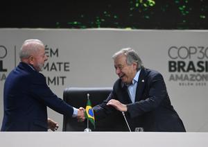 (251106) -- BELEM, 6 noviembre, 2025 (Xinhua) -- El presidente brasileño, Luiz Inácio Lula da Silva (i), saluda al secretario general de la Organización de las Naciones Unidas, António Guterres (d), en la inauguración de la Cumbre de Líderes que antecede a la 30ª Conferencia de las Partes (COP30) de las Naciones Unidas sobre el Cambio Climático, en Belém, estado de Pará, Brasil, el 6 de noviembre de 2025. El presidente de Brasil, Luiz Inácio Lula da Silva, convocó el jueves a acelerar la transición energética hacia fuentes renovables y a proteger la naturaleza para contener el calentamiento global, al inaugurar la Cumbre de Líderes que antecede a la COP30 de las Naciones Unidas sobre el Cambio Climático, que se realizará del 10 al 21 de noviembre en la ciudad de Belém del estado amazónico de Pará (norte). (Xinhua/Lucio Tavora) (lt) (jg) (ah) (da)