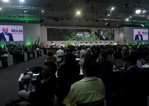 (251106) -- BELEM, 6 noviembre, 2025 (Xinhua) -- Pantallas gigantes muestran al presidente brasileño, Luiz Inácio Lula da Silva, hablando en la inauguración de la Cumbre de Líderes que antecede a la 30ª Conferencia de las Partes (COP30) de las Naciones Unidas sobre el Cambio Climático, en Belém, estado de Pará, Brasil, el 6 de noviembre de 2025. El presidente de Brasil, Luiz Inácio Lula da Silva, convocó el jueves a acelerar la transición energética hacia fuentes renovables y a proteger la naturaleza para contener el calentamiento global, al inaugurar la Cumbre de Líderes que antecede a la COP30 de las Naciones Unidas sobre el Cambio Climático, que se realizará del 10 al 21 de noviembre en la ciudad de Belém del estado amazónico de Pará (norte). (Xinhua/Lucio Tavora) (lt) (jg) (ah) (da)