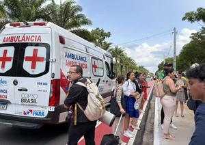 (251120) -- BELEM, 20 noviembre, 2025 (Xinhua) -- Una ambulancia se dirige a la sede de la 30ª Conferencia de las Partes (COP30) de la Convención Marco de las Naciones Unidas sobre el Cambio Climático tras un incendio en uno de los pabellones, en Belém, estado de Pará, Brasil, el 20 de noviembre de 2025. Un fuerte incendio se registró el jueves en uno de los pabellones donde se realiza la COP30 en la ciudad brasileña de Belém, por lo que decenas de personas fueron evacuadas por los Bomberos del estado de Pará a cargo de la seguridad del lugar. (Xinhua/Chen Haoquan) (ah) (ra) (ce)