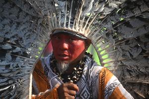 (251115) -- BELEM, 15 noviembre, 2025 (Xinhua) -- Un indígena participa en la Marcha Global por el Clima durante la 30ª Conferencia de las Partes (COP30) de la Convención Marco de las Naciones Unidas sobre el Cambio Climático, en Belém, estado de Pará, Brasil, el 15 de noviembre de 2025. (Xinhua/Lucio Tavora) (lt) (oa) (da)