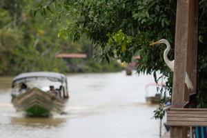 (251027) — BELEM, 27 octubre, 2025 (Xinhua) — Imagen proveída por la Confederación Nacional de Agrícola (CNA) de Brasil del 21 de octubre de 2025 de un barco navegando frente a una garceta en el «igarapé» (palabra brasileña para describir un curso de agua estrecho y de poca profundidad) del Río Guamá que conduce a la isla de Combú, frente a la ciudad de Belém, en el estado de Pará, en la región norte de Brasil. En la ribera del río Guamá, frente a la ciudad brasileña de Belém, la isla de Combú se ha convertido en un símbolo del equilibrio entre desarrollo, cultura y preservación ambiental y es también el lugar donde se transforma el cacao nativo de la selva en uno de los chocolates artesanales más reconocidos de la Amazonia. (Xinhua/CNA) (rtg) (ah) (ce)