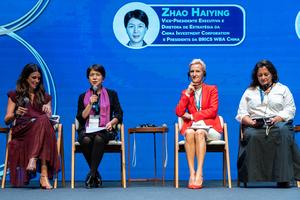 (250328) -- BELO HORIZONTE, 28 marzo, 2025 (Xinhua) -- Imagen del 26 de marzo de 2025 de la presidenta del capítulo chino de la Alianza Empresarial de Mujeres de los BRICS (BRICS WBA, por sus siglas en inglés), Zhao Haiying (2-i), hablando durante un panel de discusión en el WEForum, en Belo Horizonte, Brasil. El emprendimiento femenino es importante en los países BRICS, aunque todavía hay falta de oportunidades, según afirmaron los más de 1.150 participantes en el WEForum, un importante encuentro de negocios promovido por la BRICS WBA, que se concluyó el jueves en Belo Horizonte, Brasil. (Xinhua/Paulo Lopes) (jg) (da) (vf)