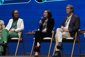 (250328) -- BELO HORIZONTE, 28 marzo, 2025 (Xinhua) -- Imagen del 27 de marzo de 2025 de la presidenta de la empresa regional sudamericana de la Compañía de Construcción de Comunicaciones de China, Hu Zhimin (c), hablando en el WEForum, en Belo Horizonte, Brasil. El emprendimiento femenino es importante en los países BRICS, aunque todavía hay falta de oportunidades, según afirmaron los más de 1.150 participantes en el WEForum, un importante encuentro de negocios promovido por la Alianza Empresarial de Mujeres de los BRICS (BRICS WBA, por sus siglas en inglés), que se concluyó el jueves en Belo Horizonte, Brasil. (Xinhua/Paulo Lopes) (jg) (da) (vf)