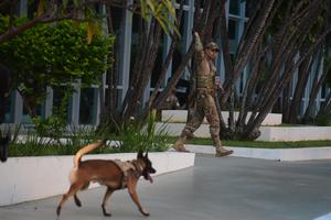 (250522) -- BRASILIA, 22 mayo, 2025 (Xinhua) -- Un soldado y un perro detector de bombas patrullan frente al Ministerio de Desarrollo Social, Familia y Combate al Hambre de Brasil tras una amenaza de bomba, en Brasilia, Brasil, el 22 de mayo de 2025. (Xinhua/Lucio Tavora) (lt) (rtg) (ra) (ce)