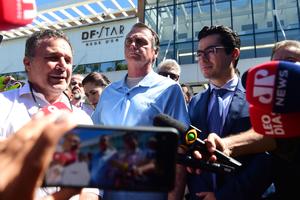 (250504) -- BRASILIA, 4 mayo, 2025 (Xinhua) -- El expresidente brasileño Jair Bolsonaro (c) habla con la prensa al retirarse del Hospital DF Star, en donde fue hospitalizado para recuperarse de la cirugía, en Brasilia, Brasil, el 4 de mayo de 2025. (Xinhua/Lucio Tavora) (lt) (rtg) (da)
