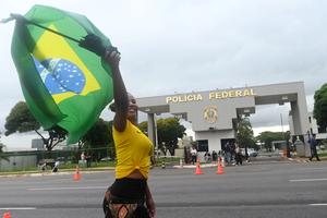 (251123) -- BRASILIA, 23 noviembre, 2025 (Xinhua) -- Una simpatizante del expresidente brasileño, Jair Bolsonaro, quien se encuentra en detención preventiva, sostiene una bandera nacional brasileña en la entrada de la Superintendencia de la Policía Federal, en Brasilia, capital de Brasil, el 23 de noviembre de 2025. La detención de Bolsonaro fue hecha efectiva por riesgo "concreto" de fuga, reveló el sábado el Supremo Tribunal Federal de Brasil. (Xinhua/Lucio Tavora) (lt) (rtg) (ah)