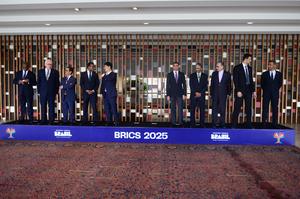 (250225) -- BRASILIA, 25 febrero, 2025 (Xinhua) -- Jefes negociadores de los países del grupo BRICS asisten a la toma de una fotografía familiar previo a la primera reunión de Sherpas (jefes negociadores) del grupo BRICS, en el Palacio de Itamaraty, en Brasilia, Brasil, el 25 de febrero de 2025. El ministro de Relaciones Exteriores de Brasil, Mauro Vieira, abrió el martes en la ciudad de Brasilia, la primera reunión de Sherpas del grupo BRICS bajo la presidencia brasileña, confirmó la cancillería. (Xinhua/Lucio Tavora) (lt) (jg) (ra) (ce)