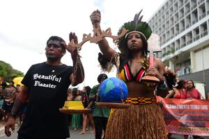 (250408) -- BRASILIA, 8 abril, 2025 (Xinhua) -- Indígenas cargan una balanza mientras participan en una manifestación en el Campamento "Tierra Libre", un campamento de protesta para exigir la demarcación de tierras y defender los derechos culturales, en Brasilia, Brasil, el 8 de abril de 2025. (Xinhua/Lucio Tavora) (lt) (oa) (ah) (ce)