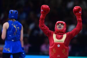 (250906) -- BRASILIA, 6 septiembre, 2025 (Xinhua) -- Sedigheh Dariaeivarkadeh (frente), de Irán, festeja la victoria al término del combate final femenino de sanda de 65 kilogramos ante Sudenaz Gulay, de Turquía, en el 17 Campeonato Mundial de Wushu, en Brasilia, Brasil, el 6 de septiembre de 2025. (Xinhua/Lucio Tavora) (lt) (rtg) (da)