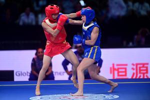 (250903) -- BRASILIA, 3 septiembre, 2025 (Xinhua) -- Ching Chan (i), de Hong Kong de China, compite con Nazarena Liliana Roca (d), de Argentina, durante el combate femenino de sanda de -56 kilogramos en el 17 Campeonato Mundial de Wushu, en Brasilia, Brasil, el 3 de septiembre de 2025. (Xinhua/Lucio Tavora) (lt) (ah) (ra) (vf)