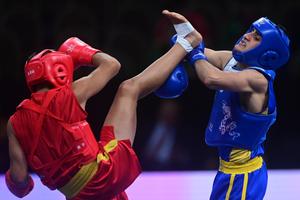(250904) -- BRASILIA, 4 septiembre, 2025 (Xinhua) -- Imagen del 3 de septiembre de 2025 de Erick de Carvalho Ferreira (d), de Brasil, compitiendo con Tiago Martins (i), de Portugal, durante el combate masculino de sanda de -56 kg, en el 17 Campeonato Mundial de Wushu, en Brasilia, Brasil. (Xinhua/Lucio Tavora) (lt) (rtg) (ra) (ce)