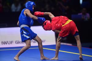 (250904) -- BRASILIA, 4 septiembre, 2025 (Xinhua) -- Imagen del 3 de septiembre de 2025 de Héctor Reyes (d), de Venezuela, compitiendo con Karim Iminzhanov (i), de Kazajistán, durante el combate masculino de sanda de -56 kg, en el 17 Campeonato Mundial de Wushu, en Brasilia, Brasil. (Xinhua/Lucio Tavora) (lt) (rtg) (ra) (ce)