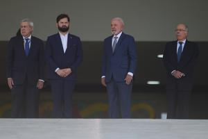 (250422) -- BRASILIA, 22 abril, 2025 (Xinhua) -- (De izq. a der.) El ministro de Relaciones Exteriores chileno, Alberto van Klaveren Stork, el presidente chileno, Gabriel Boric, el presidente brasileño, Luiz Inácio Lula da Silva, y el ministro de Relaciones Exteriores brasileño, Mauro Vieira, asisten a una ceremonia de bienvenida llevada a cabo en el Palacio de Planalto, en Brasilia, Brasil, el 22 de abril de 2025. Lula da Silva y Boric reafirmaron el martes su compromiso con el multilateralismo, el libre comercio y la integración regional, así como su rechazo a una guerra comercial, a una nueva "Guerra Fría". (Xinhua/Lucio Tavora) (lt) (jg) (ra) (ce)